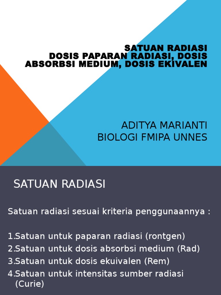 10 26 2021 Satuan Radiasi Radiasi yang telah kita kenal memiliki satuan yang berbeda dalam berbagai penggunaan radiasi dalam berbagai kegiatan manusia yaitu pertama Satuan untuk paparan radiasi dinyatakan dengan satuan Rontgen atau sering disingkat dengan R saja adalah suatu satuan yang menunjukkan besarnya intensitas sinar X atau sinar gamma yang